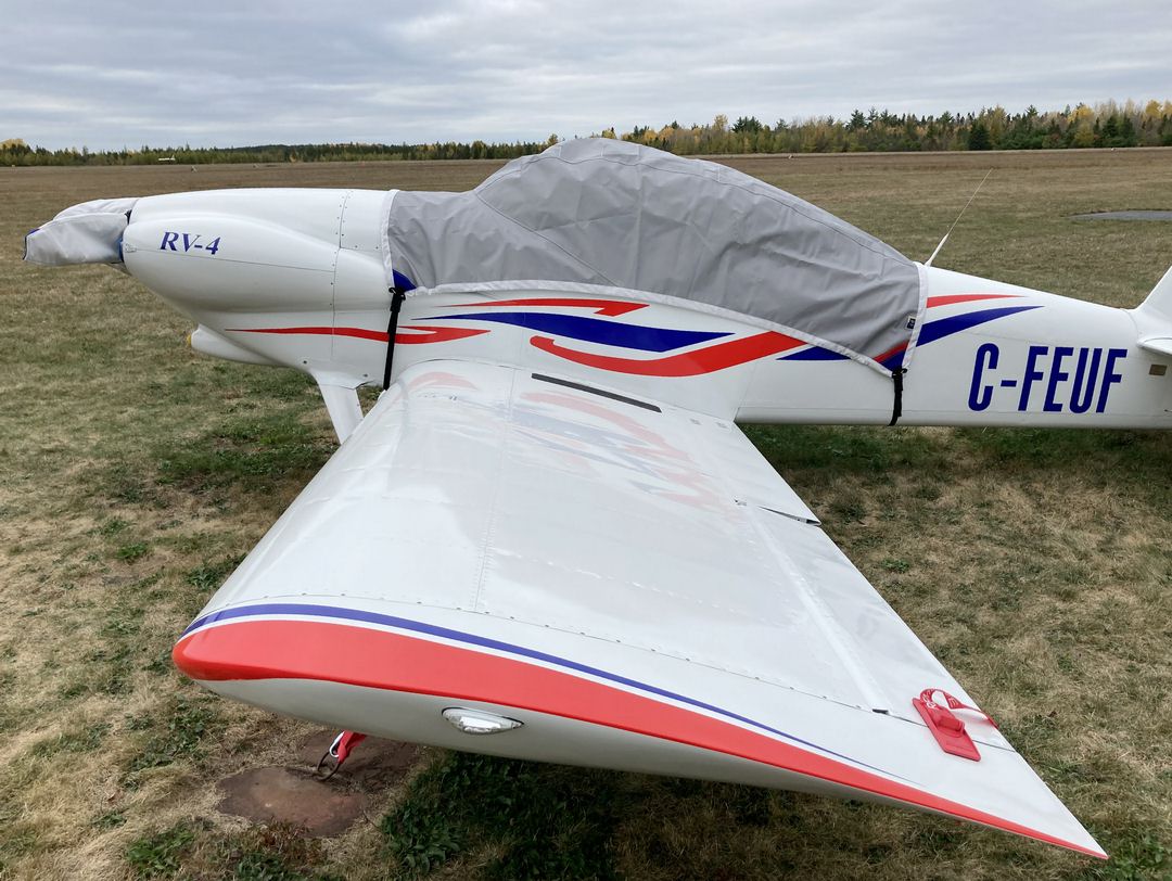 The Van's Aircraft RV-4 Wing Covers are a perfect solution to protect your paint from sun damage and prevent winter frost, snow, ice buildup, and corrosion. They are made from Solution-Dyed Polyester or Acrylic Sunbrella and form-fit to slip around each wing tip, cover the entire upper surface of the wing and wrap around the leading and trailing edges. The covers secure under the wing with adjustable straps from the trailing edge to the leading edge. The wing covers can also attach to each other with adjustable straps at the leading and trailing edges of the wing under the belly of the plane. In some instances, cut-outs are made in the trailing edge of the wing covers to accommodate static wicks. We have the ability to also accommodate wing tip modifications, such as STOL kits, droop tips, and vortex generators. Wing covers are labeled LEFT and RIGHT for your convenience. Wing Covers are available for winter use or long-term, all-year use. A Hail Protection version can be made which incorporates very dense closed cell foam into the entire upper surface of the wing covers to help prevent hail damage. Although these covers are bulky, they do help protect your wing and control surfaces against small to medium-size hail.... leer más